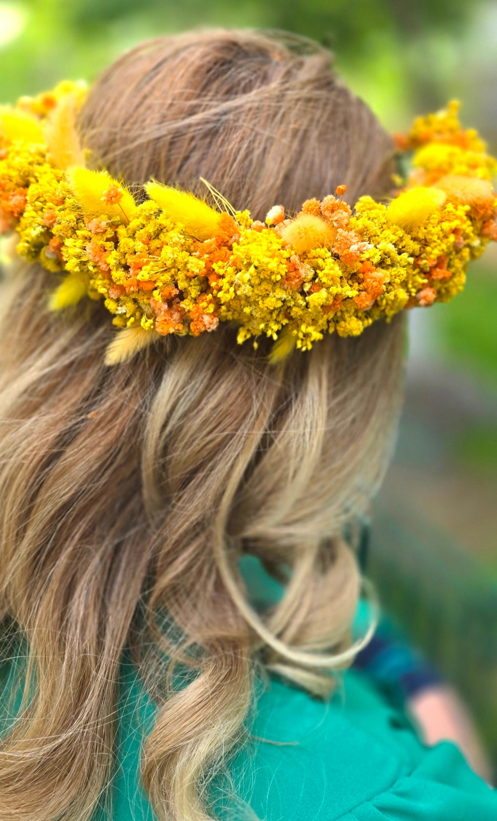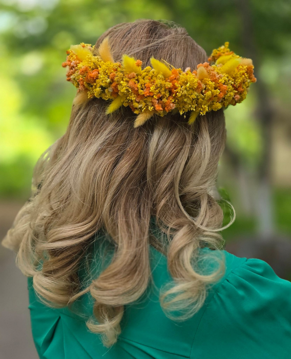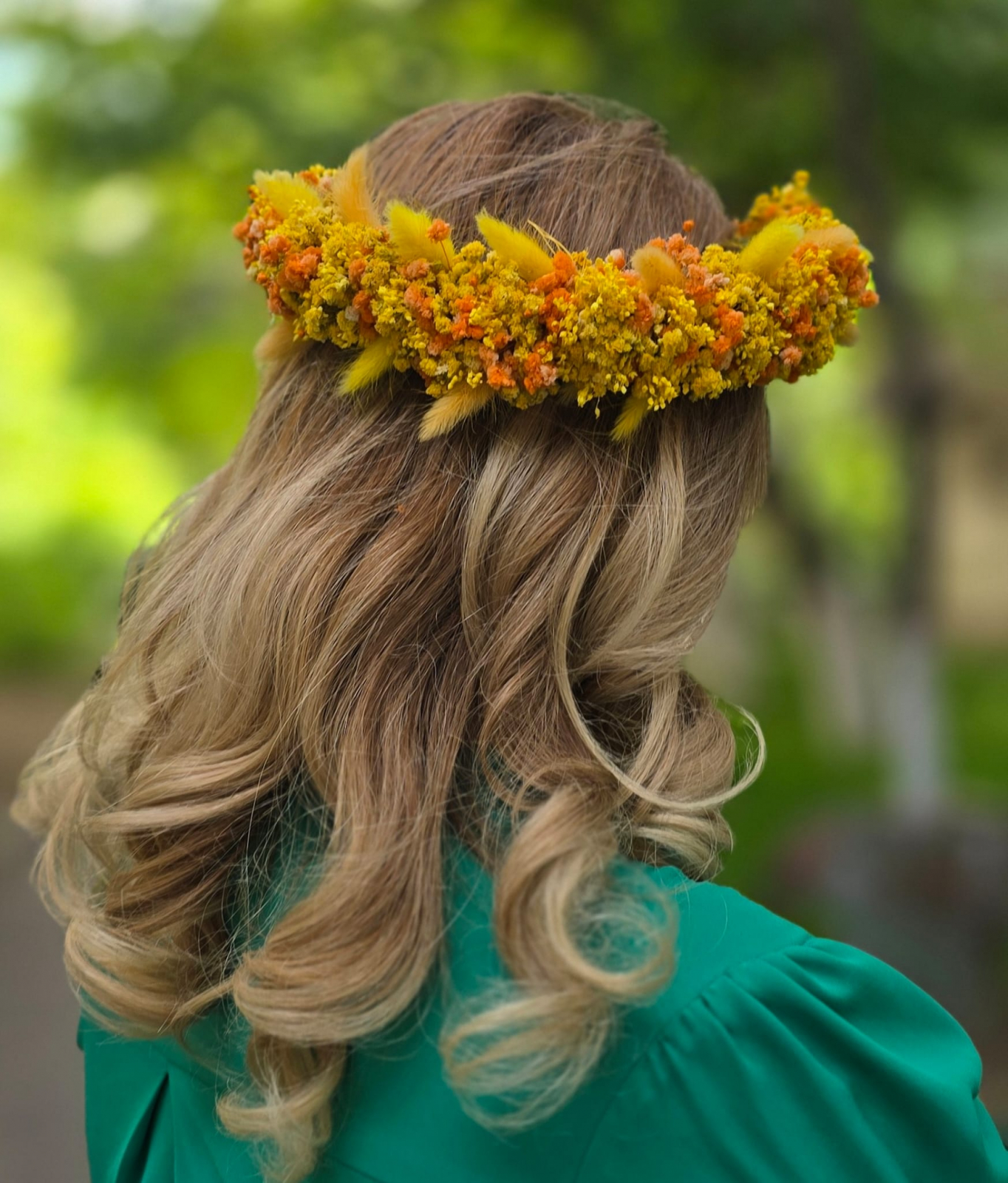 Această coroniță florală este realizată manual din flori naturale stabilizate, atent alese și aranjate în nuanțe calde de galben si portocaliu. Prin procesul de stabilizare, florile își păstrează textura, culoarea și frumusețea pentru mult timp, fără a necesita apă sau întreținere specială.