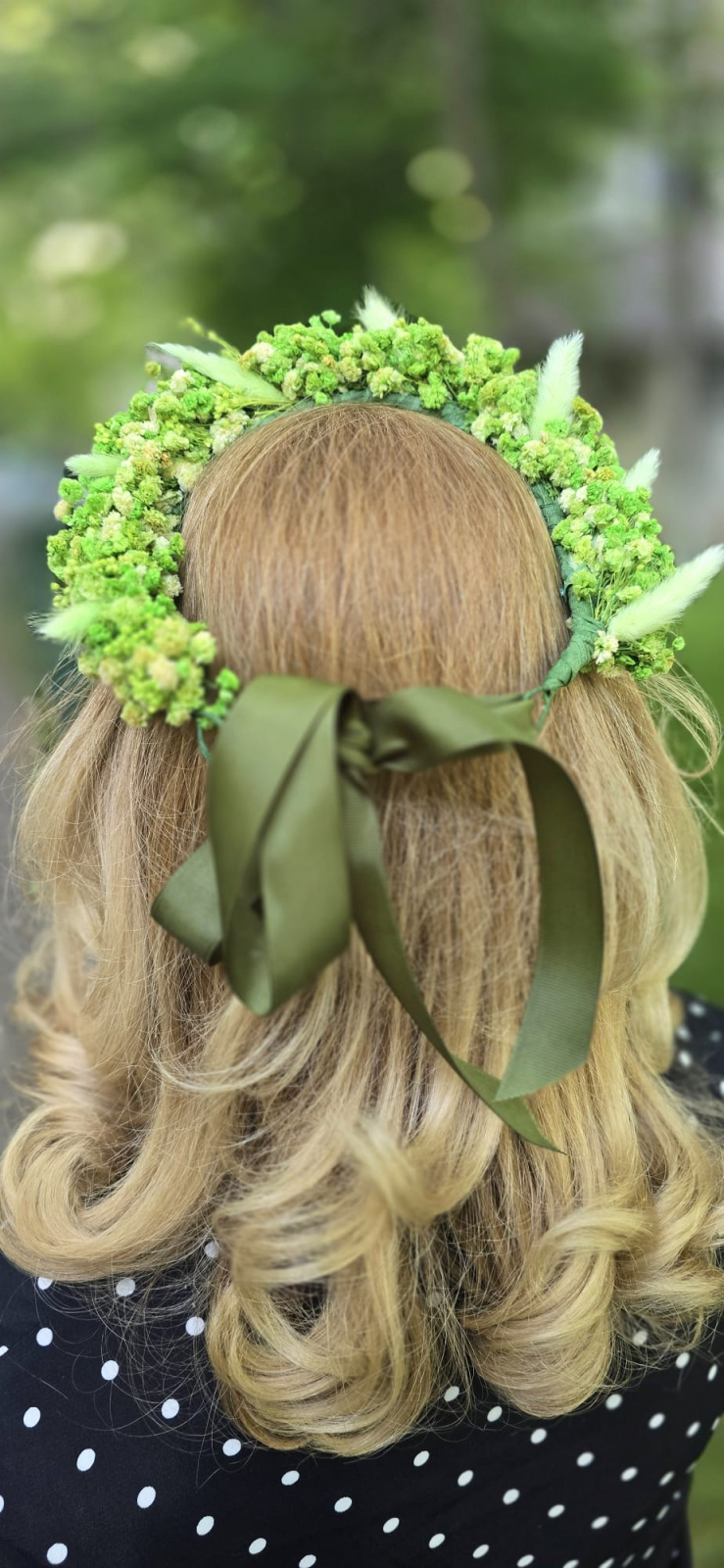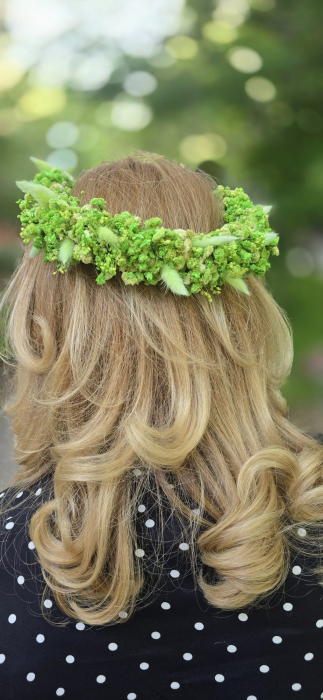 Coroniță florală realizată manual din flori naturale stabilizate, în nuanțe de verde. Rezistă în timp și aduce un strop de natură în orice moment special. Coronita este reglabila si universala.