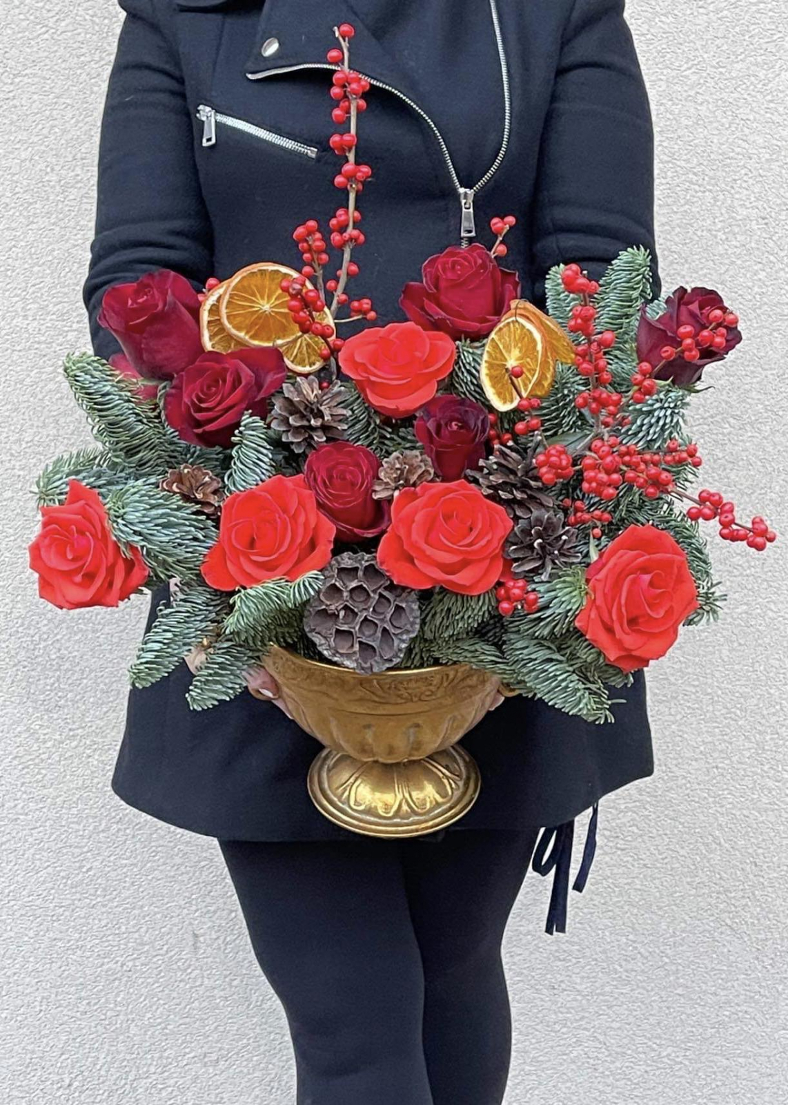 Cetina de brad, conuri, trandafiri rosii, ilex si felii de portocale. Fiecare element al acestui aranjament se îmbină cu gingășie și măiestrie, creând o simfonie vizuală și olfactivă ce încântă simțurile. Este o comoară a iernii, un colț de paradis în care frumusețea naturii se contopește armonios cu măiestria umană, dând naștere unei opere de artă efemere, menită să bucure inimile tuturor privitorilor.