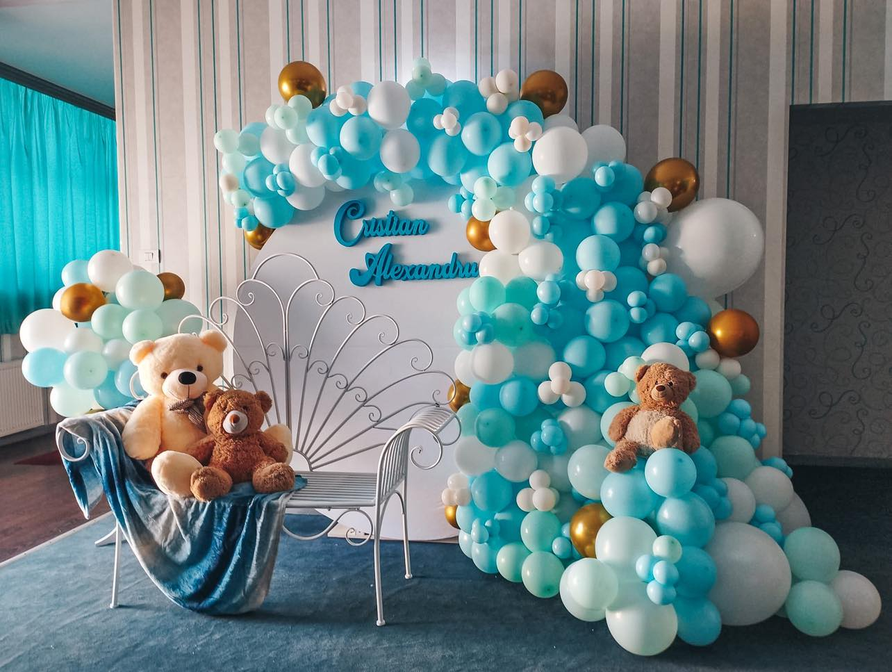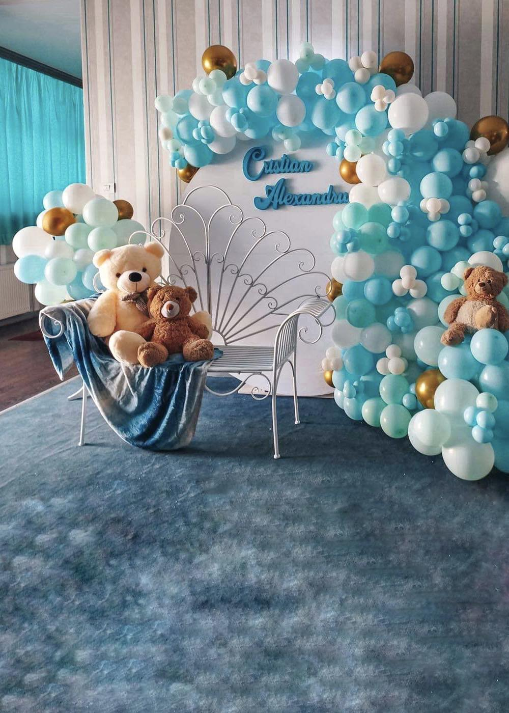 Foto corner-ul de botez decorat cu baloane albastru turcoaz este un colț al bucuriei și al culorilor vibrante, perfect pentru a captura amintiri minunate în ziua specială a botezului. Acest decor aduce o atmosferă veselă și plină de energie în eveniment.