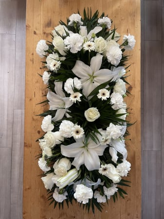 Aranjament funerar solemn, alb, un mod elegant si respectuos de a-ti lua Ramas Bun de la persoana draga care a plecat catre o alta lume.
