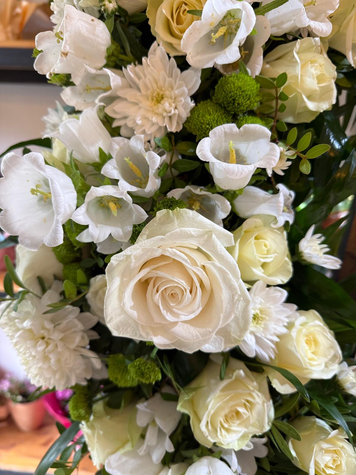 O alegere elegantă și plină de rafinament, coroana funerară „Lumina Păcii” exprimă respectul și compasiunea în cele mai delicate momente. Realizată cu grijă din flori albe proaspete – trandafiri, crizanteme, frezii și campanula – completate de accente verzi și frunze decorative, această coroană circulară simbolizează eternitatea și liniștea sufletească.