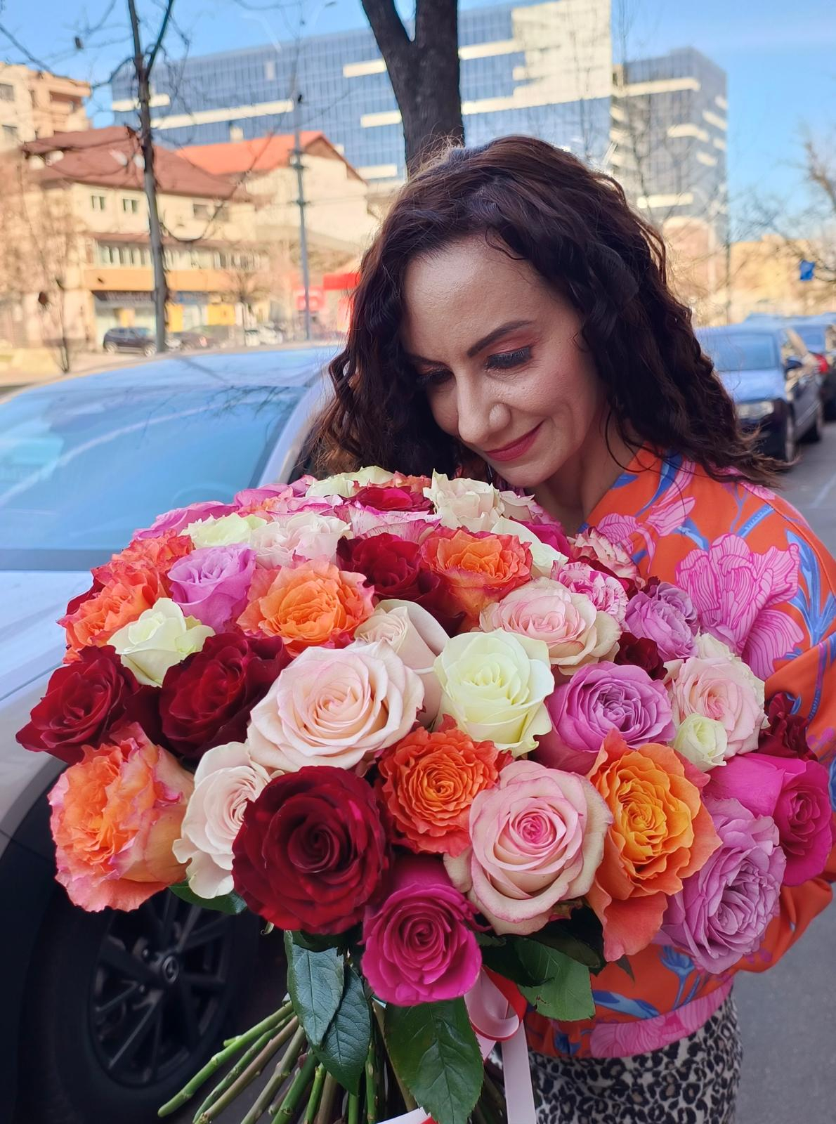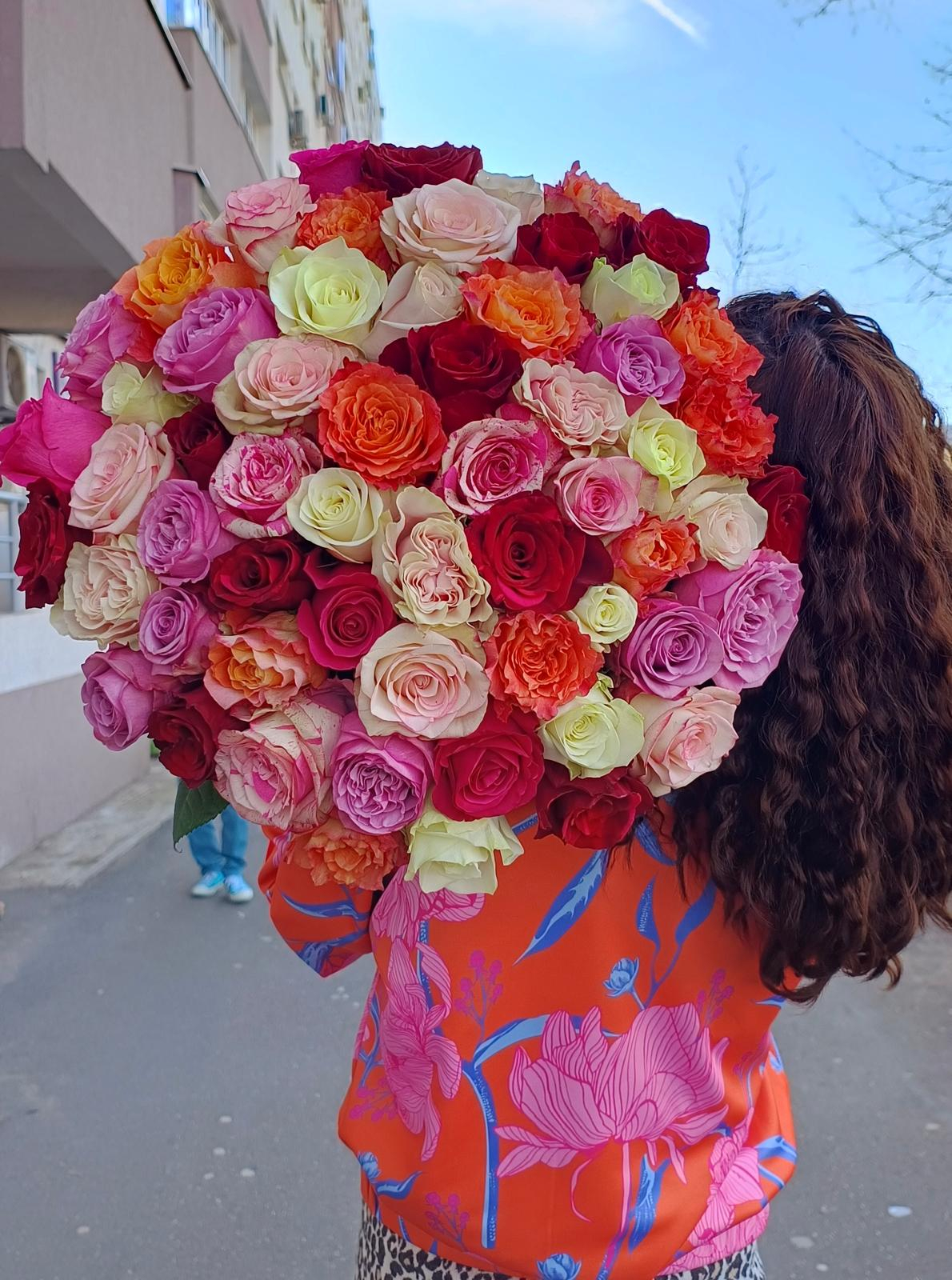 Buchetul „Culorile Fericirii” este alcătuit dintr-o selecție bogată de trandafiri multicolori, aranjați armonios pentru a transmite bucurie și căldură. Fiecare floare este aleasă atent pentru prospețime și formă, iar combinația de tonuri pastelate și intense oferă un efect vizual impresionant.