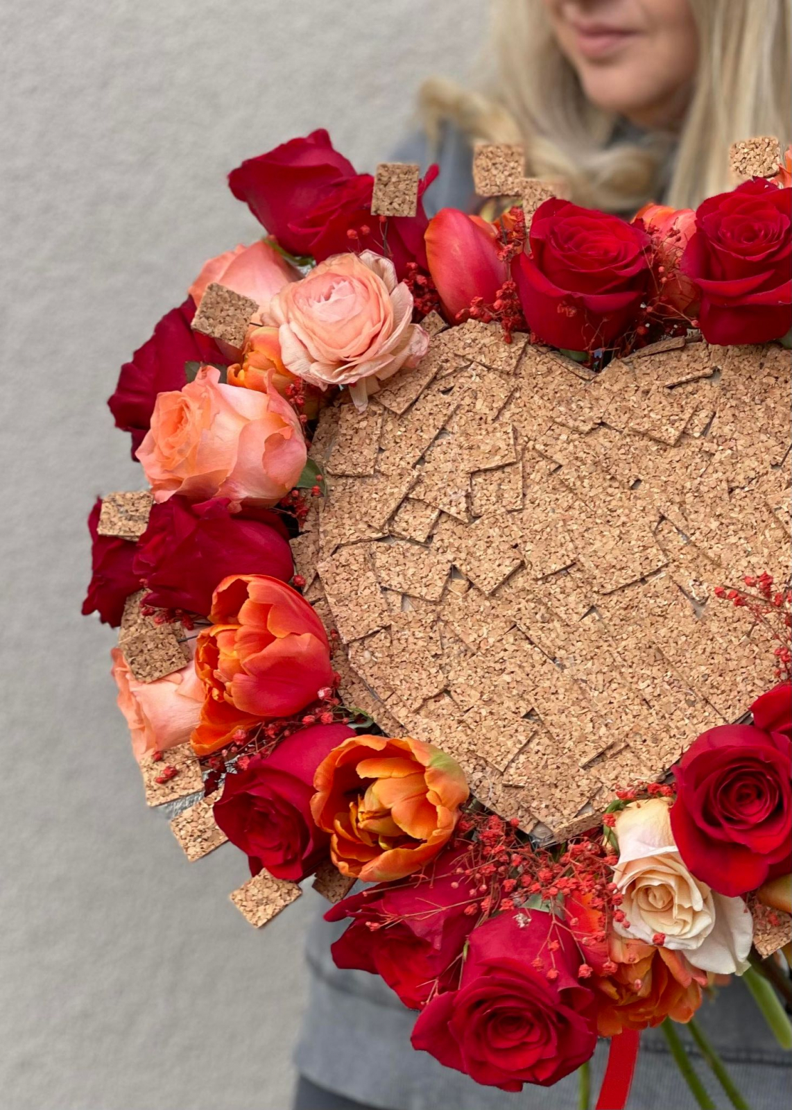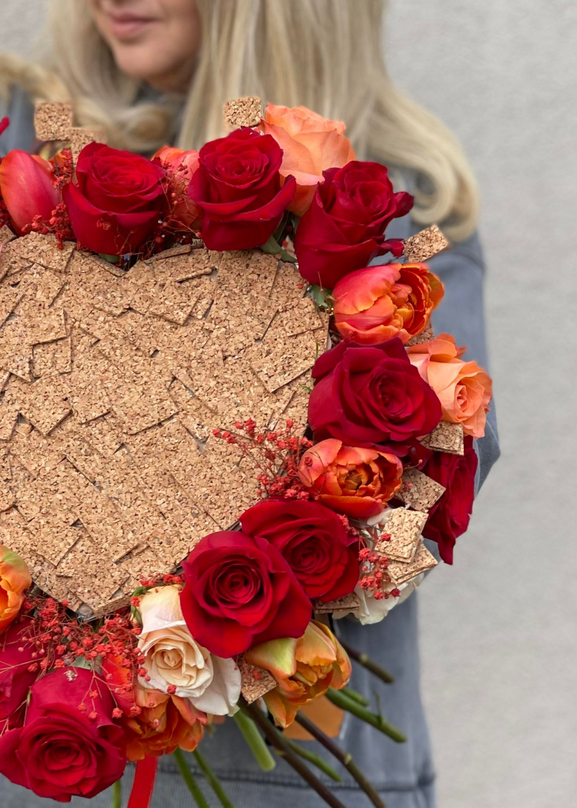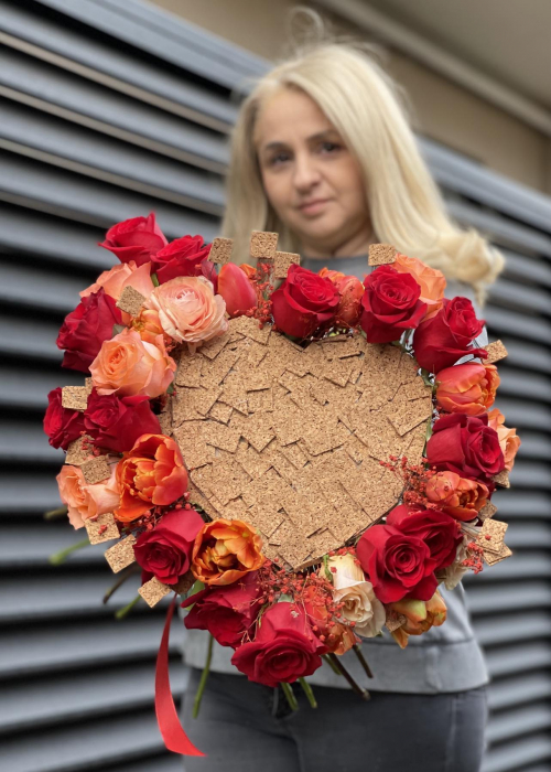 Surprinde-o cu acest buchet de flori in forma de inima, creat pe o structura metalica, usoara, imbracata in pluta, ornata cu multa maiestrie si gratie cu trandafiri rosii, lalele si gypsophila.