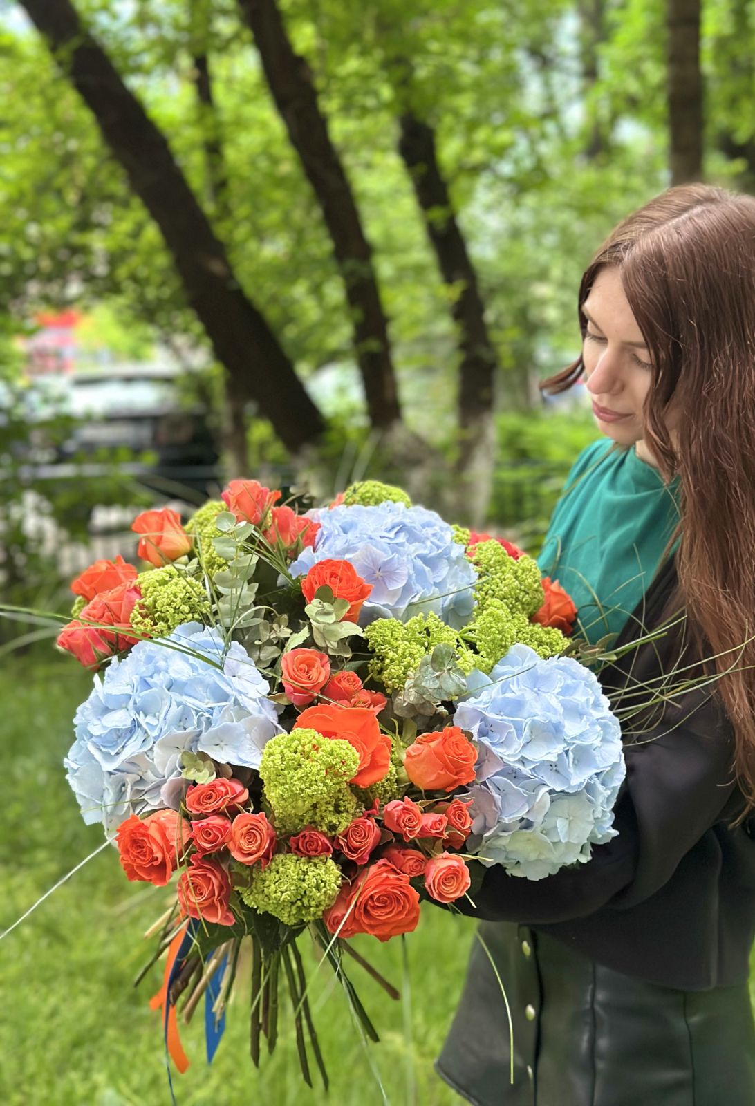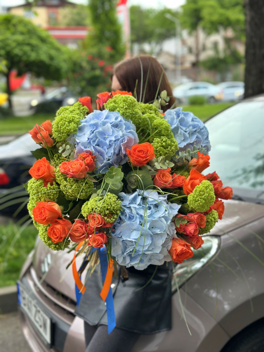 Buchetul „Impact Cromatic” este un dans al culorilor vii și al texturilor elegante – o creație florală ce combină intensitatea trandafirilor portocalii, delicatețea hortensiei albastre și prospețimea vibrantă a viburnumului verde.