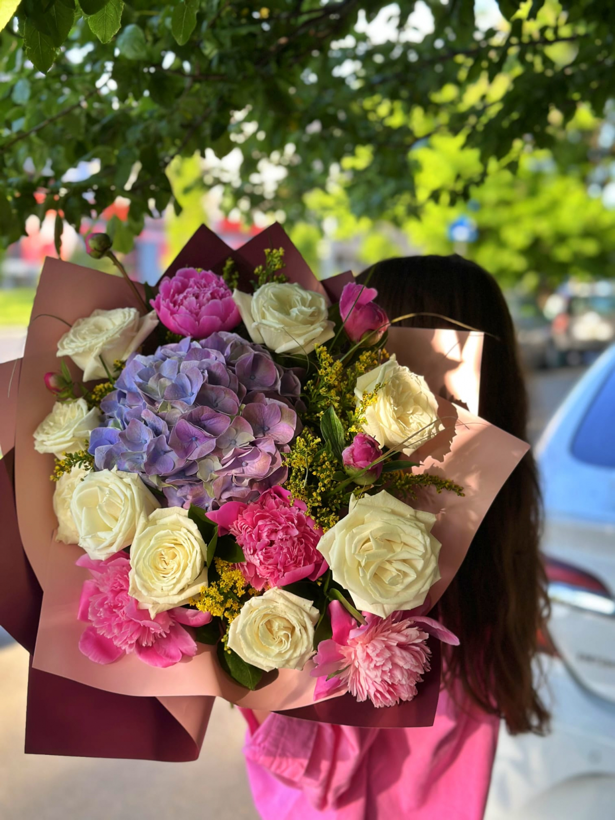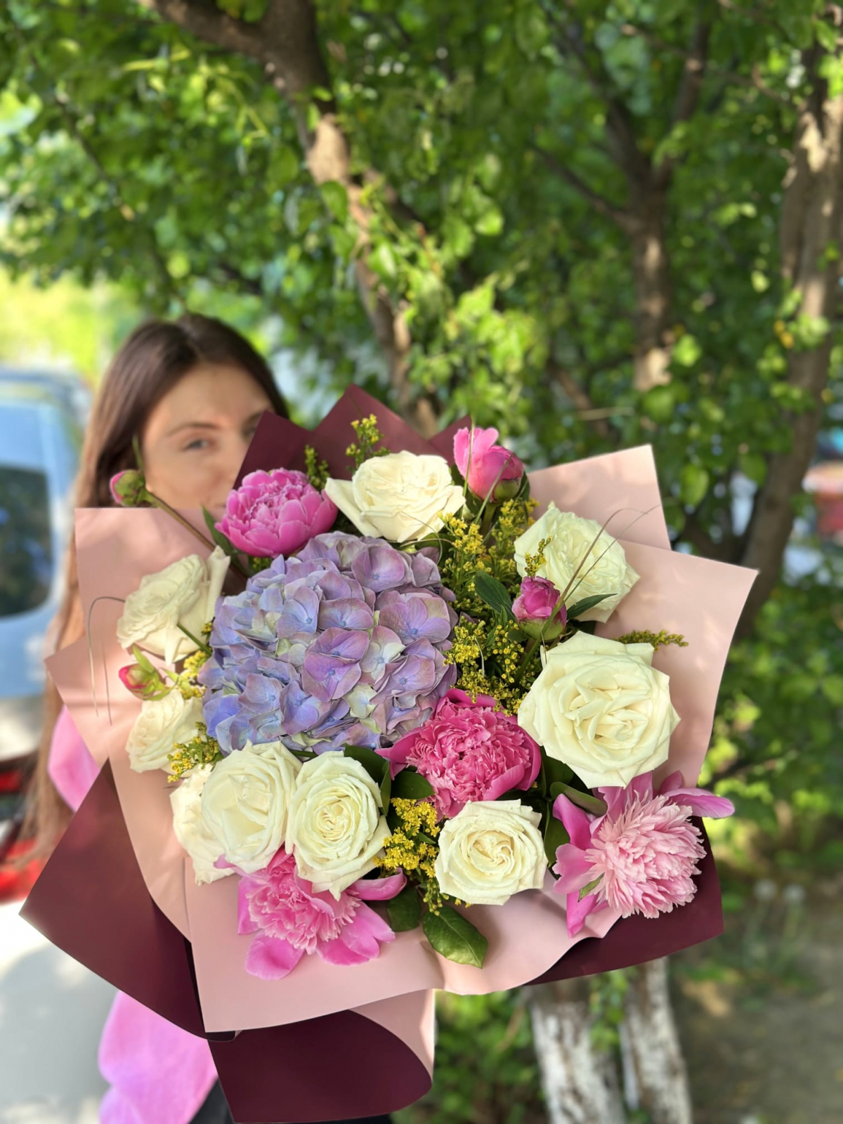 Buchet format din trandafiri albi cu formă clasică, hortensia mov cu inflorescențe bogate, bujori cu petale catifelate (în nuanțe pastelate, în funcție de sezon) și fire de solidago galben pentru contrast și volum. O combinație echilibrată de culori și texturi, potrivită pentru ocazii variate – de la cadouri elegante la decor floral de eveniment.